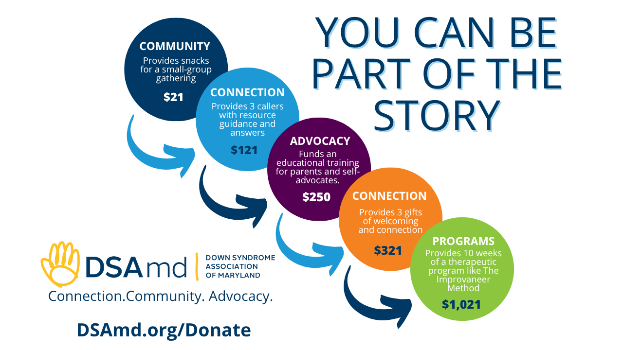 There are plenty of ways to support people with Down syndrome beyond making a donation right now. If you’d like to host a fundraising event to benefit our mission, please reach out - we’re so grateful for your help. Contact: director@DSAmd.org or 410-321-5434 with your ideas!