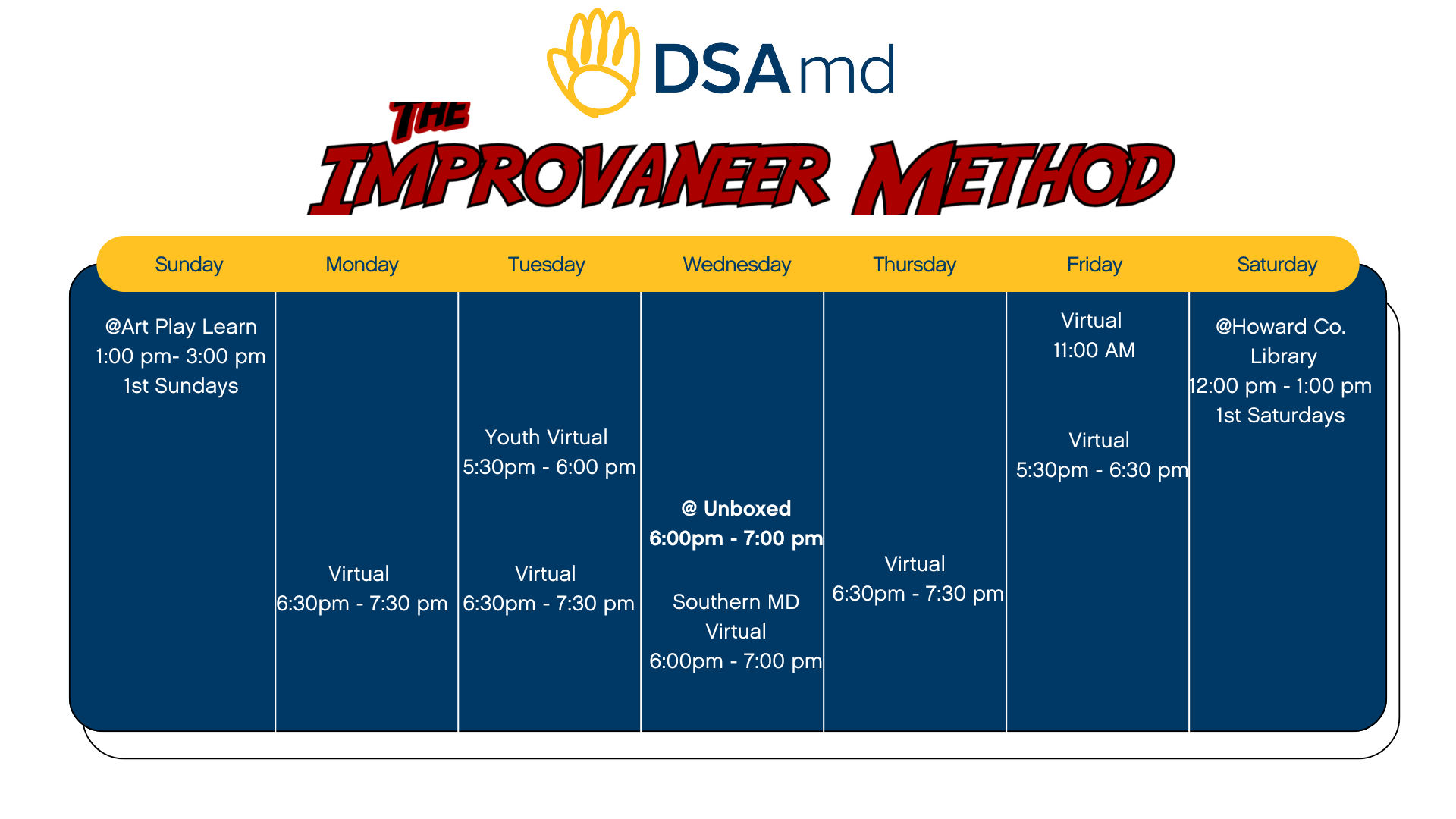 All registrations for the fall virtual sessions of The Improvaneer Method are in the bottom section of the newsletter. Including a new Youth 30-minute session on Tuesdays and an updated Friday session at 5:30 PM!