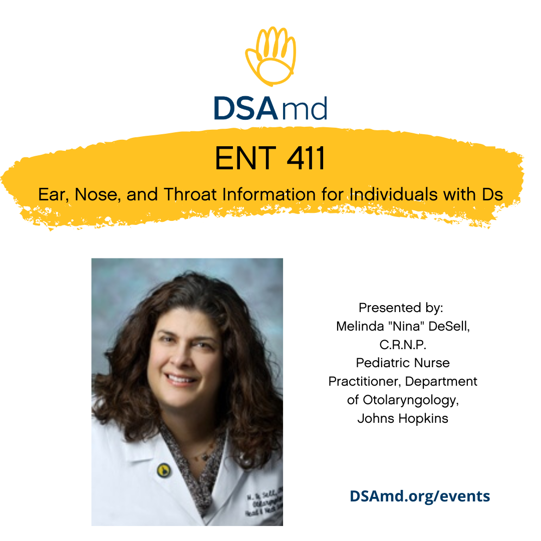 Join us for an informative session tailored for individuals with Down syndrome and their families. Melinda "Nina" DeSell, an experienced Pediatric Nurse Practitioner from the Department of Otolaryngology at Johns Hopkins, will provide valuable insights into common ear, nose, and throat (ENT) concerns for individuals with Down syndrome.