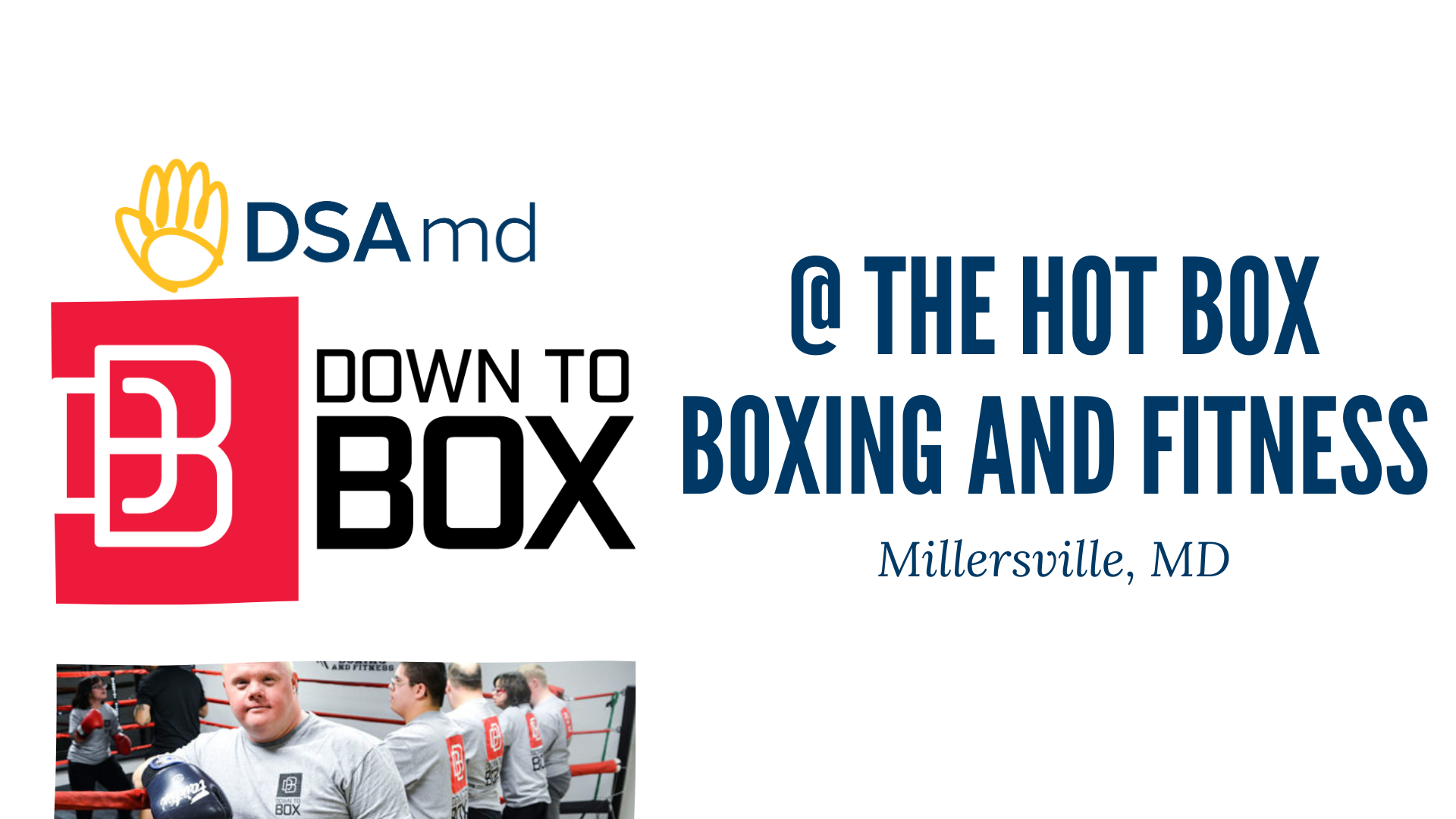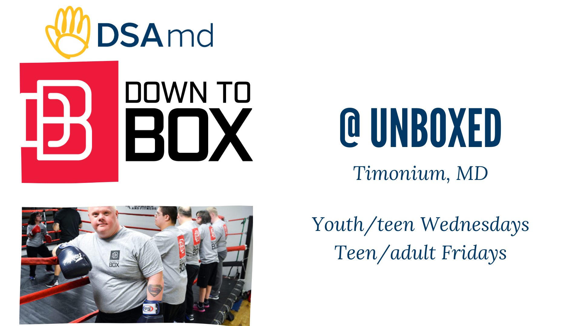 DSAmd Down to Box provides individuals with Down Syndrome the essential tools to enhance coordination, develop self-defense skills, and improve physical fitness through boxing techniques. Help us spread the word! We need at least 6 participants per class to keep our programming going.